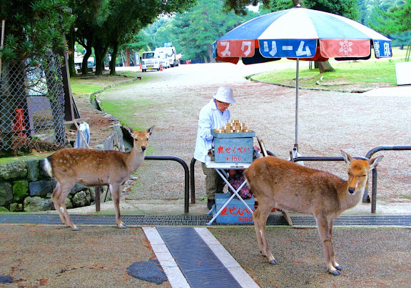 呦,人客要上門了,賣仙貝的小販跟準備吃仙貝的鹿都在做上班前的熱身。